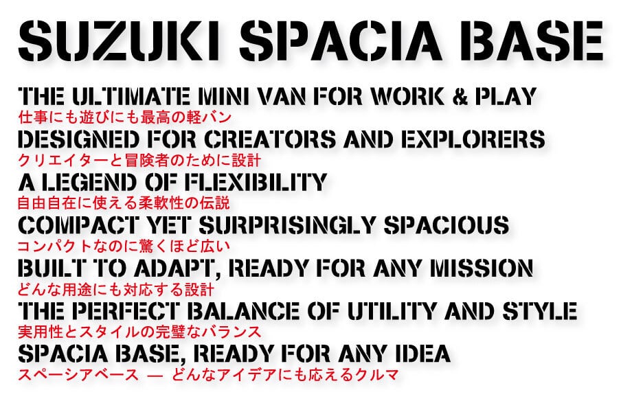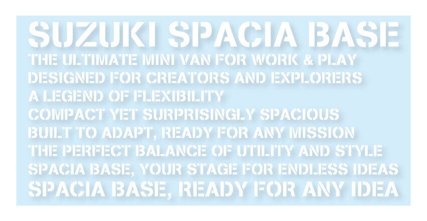 軽商用車の実用性と秘密基地のような遊び心を兼ね備えたスペーシアベース。その高い柔軟性と個性をステンシル文字でデザインに落とし込みました。