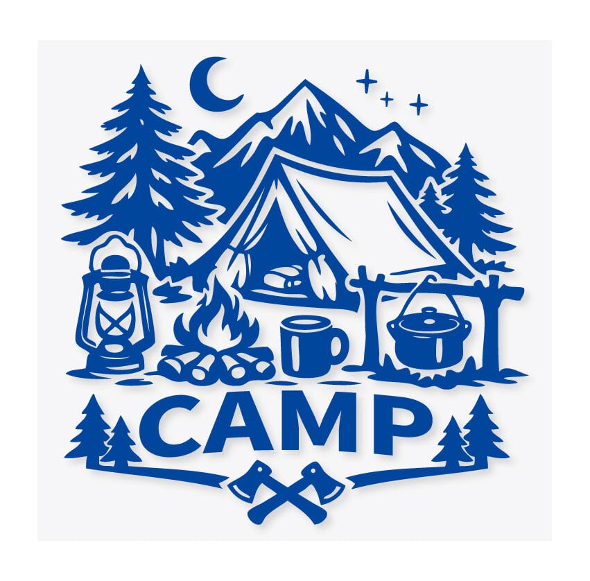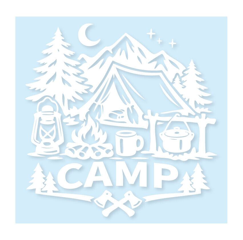 テント、焚き火、ランタン、そして美しい山々。 キャンプの魅力を凝縮したこのデザインは、愛車のリアガラスやボディはもちろん、お気に入りのキャンプ用コンテナやハードクーラーボックスのカスタムにも最適です。