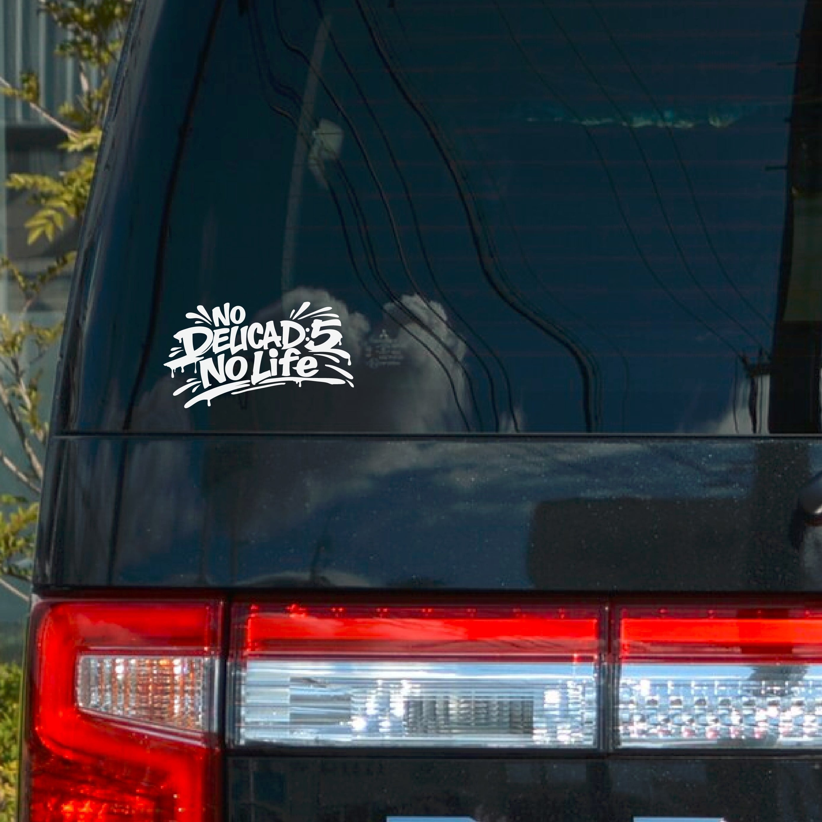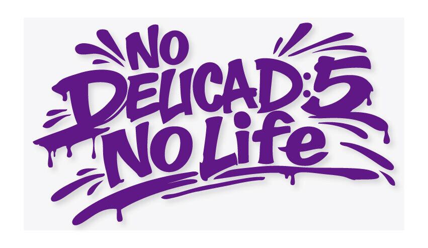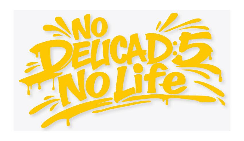 「NO DELICA:5 NO LIFE」のメッセージをストリート感溢れるグラフィティ(タギング)風にデザインした、オリジナルのカッティングステッカーです。
